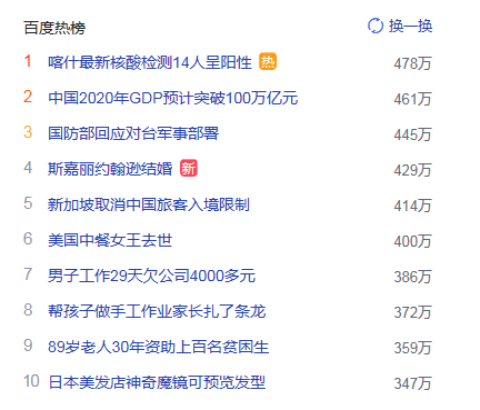 1. 喀什最新核酸檢測14人呈陽性 獵頭熱度熱點(diǎn)478萬