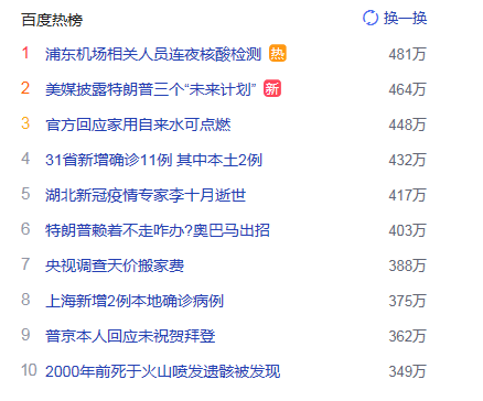 1. 浦東機(jī)場(chǎng)相關(guān)人員連夜核酸檢測(cè) 獵頭熱度熱點(diǎn)481萬