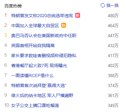 1. 特朗普發(fā)文稱2020總統(tǒng)選舉違憲 獵頭熱度熱點(diǎn)480萬(wàn)