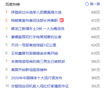 1. 拜登獲過(guò)半選舉人團(tuán)票贏得大選 獵頭熱度熱點(diǎn)490萬(wàn)
